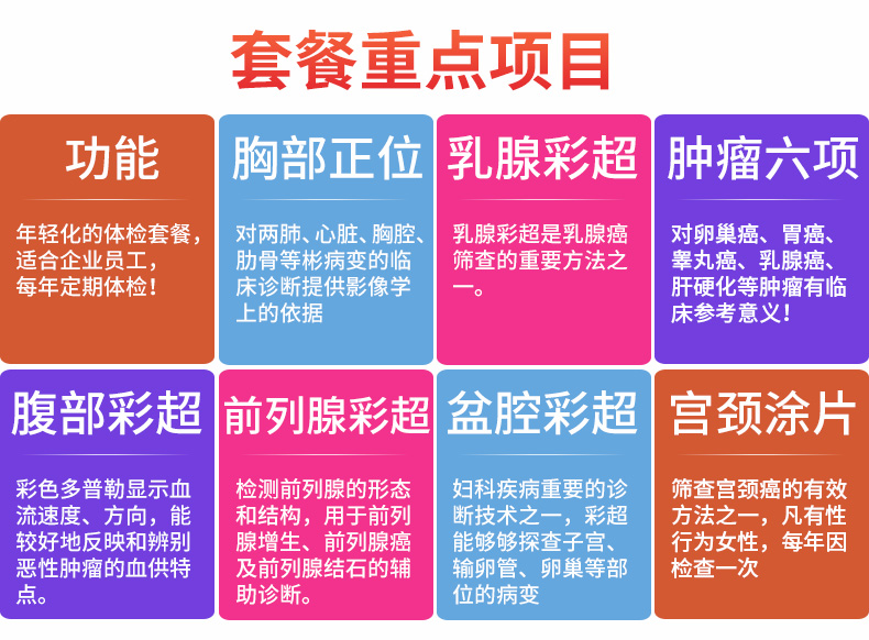 1、无中医会诊、口腔科检查、疲劳检测 2、肿瘤C12项改为肿瘤C9项,肿瘤C6项改为C3项; 3、甲状腺功能5项改为甲功5项2,甲状腺功能3项改为甲功3项2; 4、无血流变替换免疫球蛋白三项 5、总胆红素(TBIL)不单做做胆红素3项 |