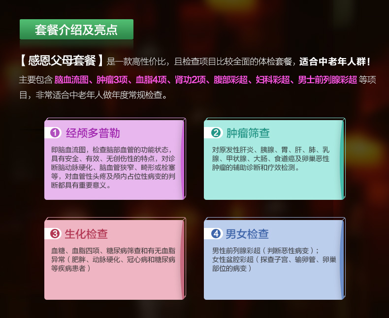 【除深圳东莞地区】感恩父母套餐即原感恩C套餐,主要含脑血流图,肿瘤3项,血脂4项,肾功能3项,腹部彩超,妇科彩超,男士前列腺彩超等等项目,比较全面的套餐,适合老年人做年度常规检查。 |