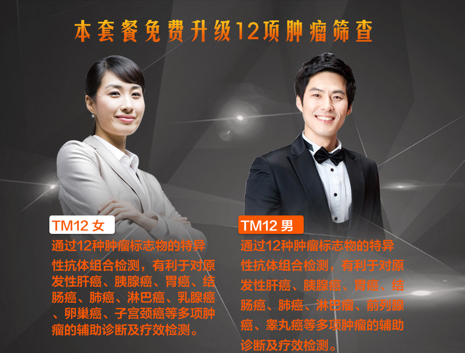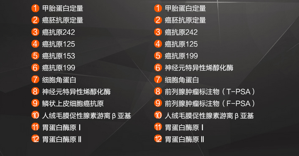 | TM12(女性) | 甲胎蛋白(T-12),癌胚抗原(T-12),糖类抗原19-9(T-12),糖类抗原242(T-12),糖类抗原125(T-12),糖类抗原15-3(T-12),细胞角蛋白19片段(T-12),神经元特异性烯醇化酶(T-12),胃蛋白酶原Ⅰ(T-12),胃蛋白酶原Ⅱ(T-12),PGI/PGII,人绒毛膜促性腺激素游离β亚基(T-12),鳞状上皮细胞癌相关抗原(T-12) | 检测筛查肺癌、食道癌、胃癌、肝癌、胰腺癌、大肠癌、乳腺癌、宫颈癌等多种常见肿瘤。 | √ | |