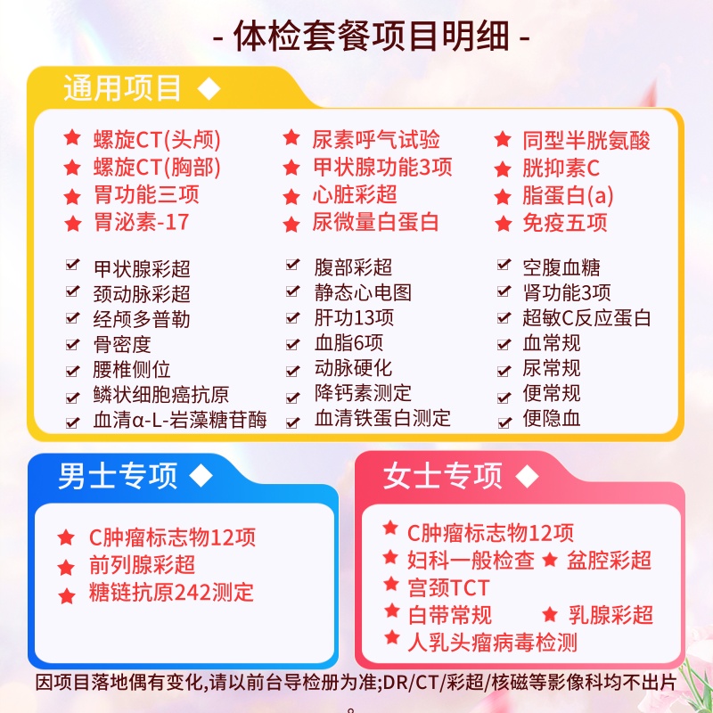 分院休息时间可能发生变化,请以预约时看到的分院和排期为准!因各地区体检设备不同,造成个别项目存在差异,具体体检项目请以前台导检册为准(拍套餐联系客服进行预约)